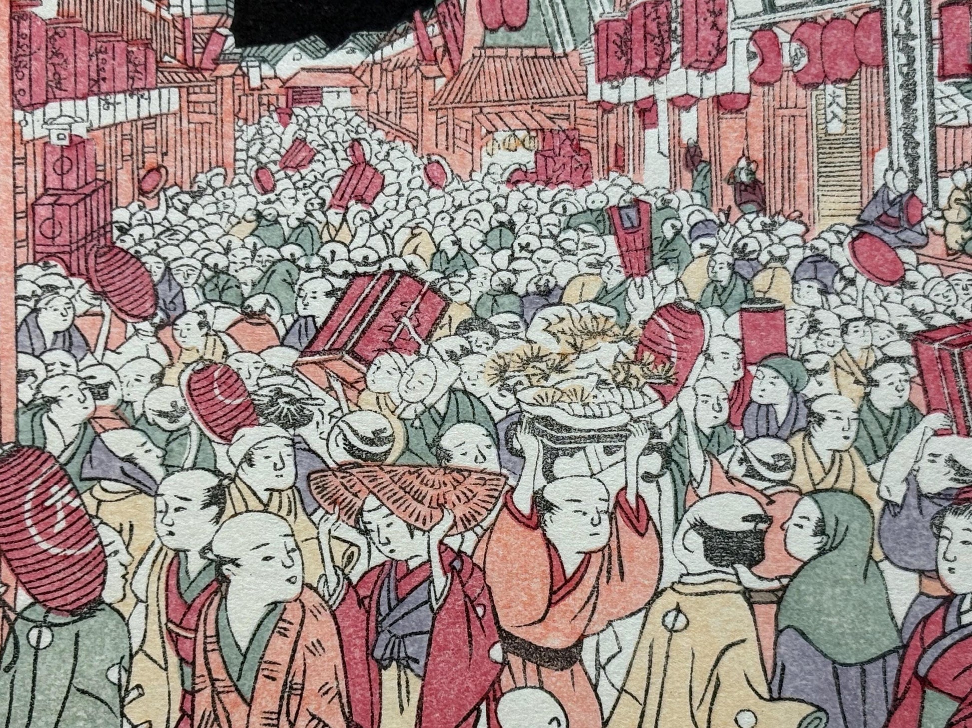 Japanese Ukiyoe, woodcut print, Utagawa Toyoharu, "Night sight in the Kao-mise season at the Theater District of Sakai-cho and Fukiya-cho"