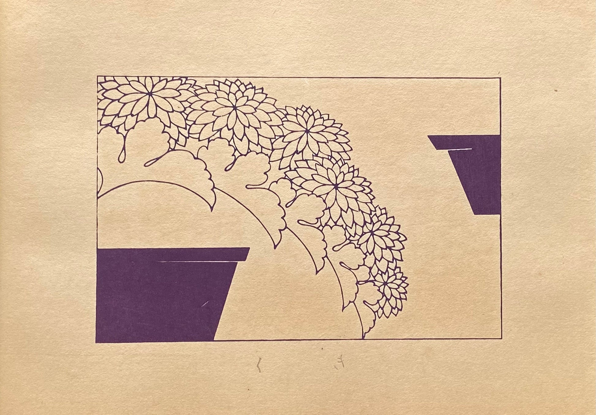 Japanese design, antique, woodcut print, 1933, Kawarazaki Kodo, Antique Woodcut Design Print, chrysanthemum.