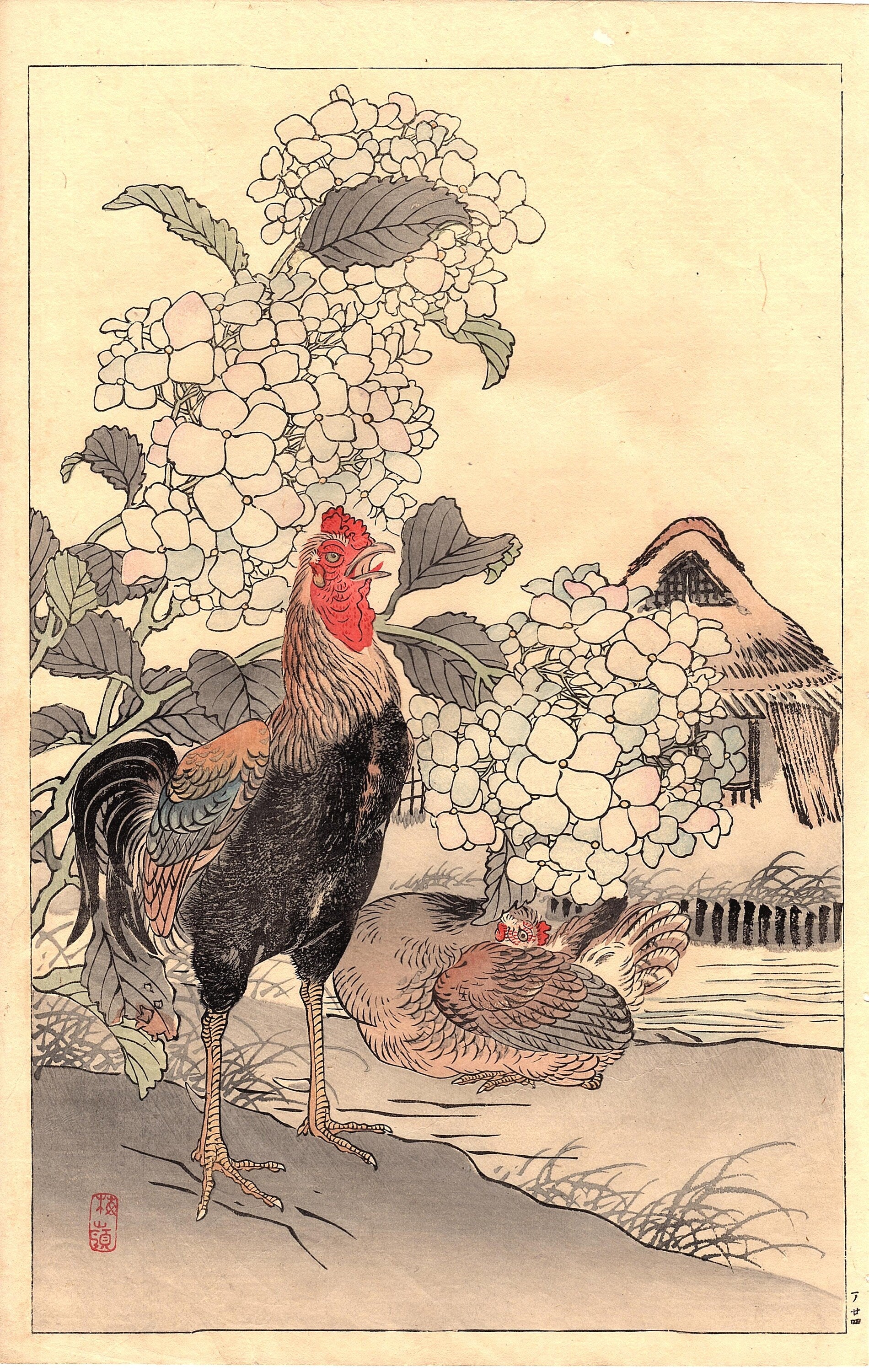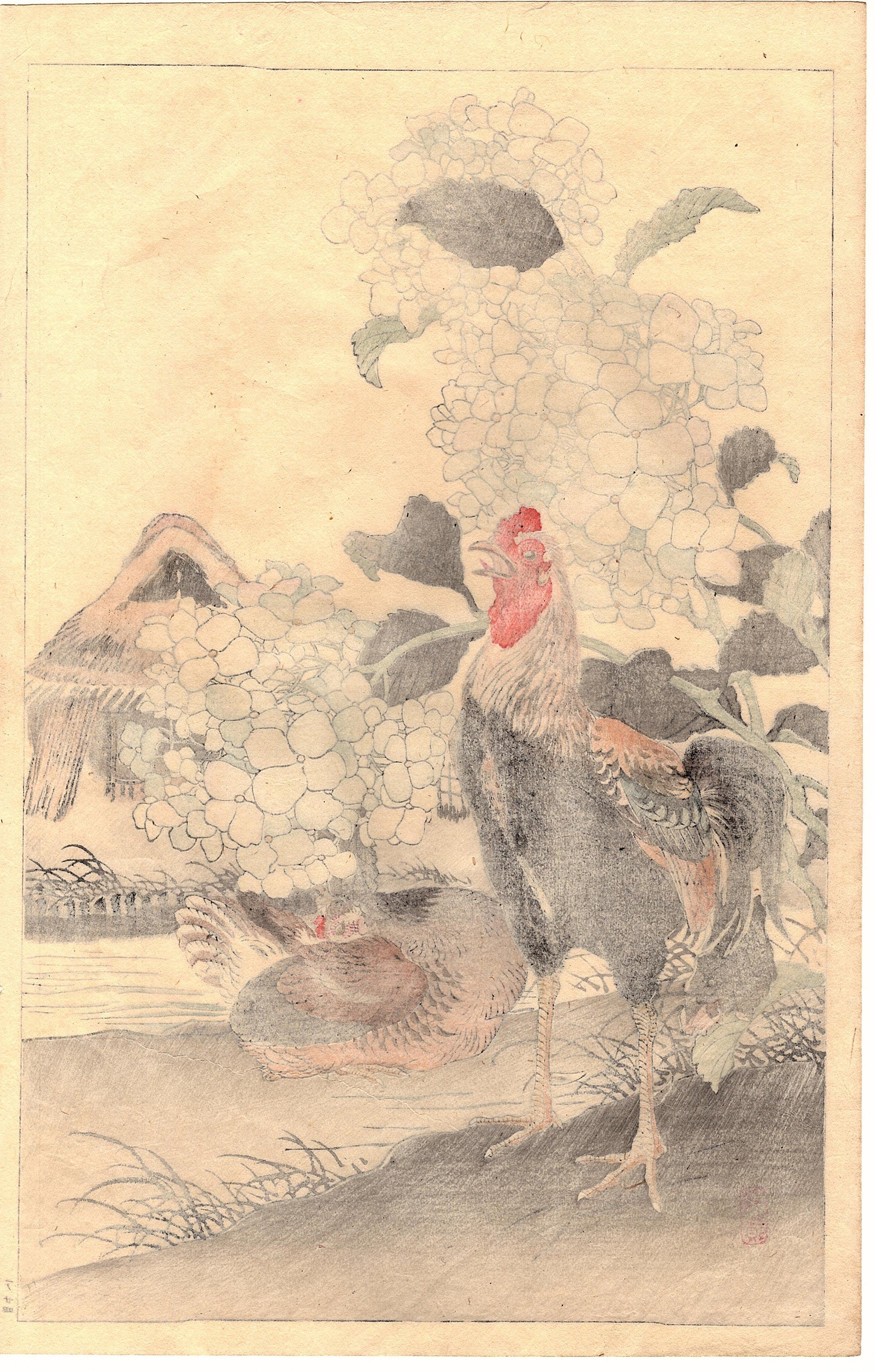 Japanese Antique Original Woodcut Print, Kono Bairei, "Bairei’s Book of Birds and Flowers". 1