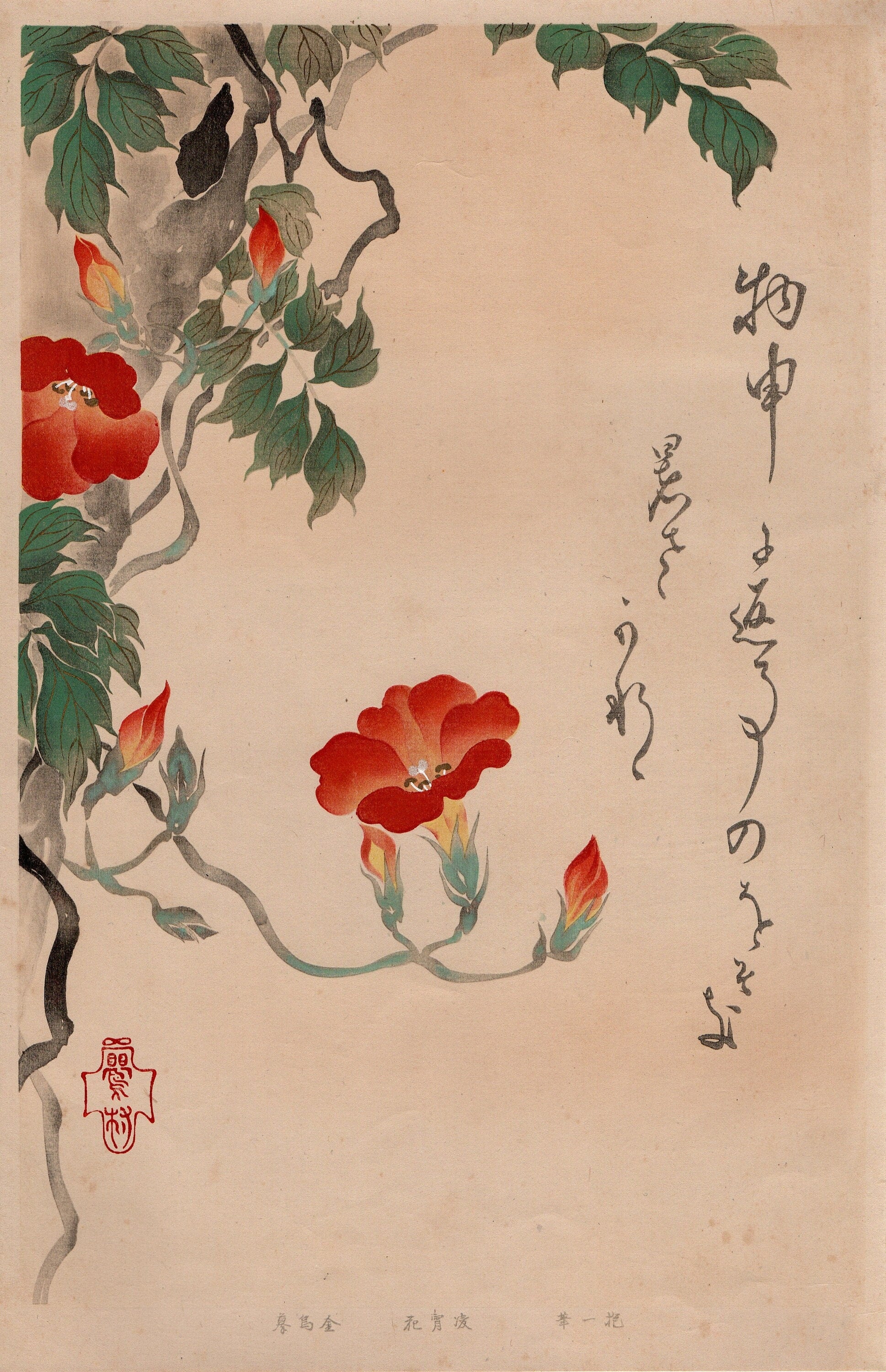 Japanese design, antique, woodcut print, 1930, Sakai Hoitsu, "Album of Hundred Flowers by Artists of Rinpa School, Chinese trumpet vine”