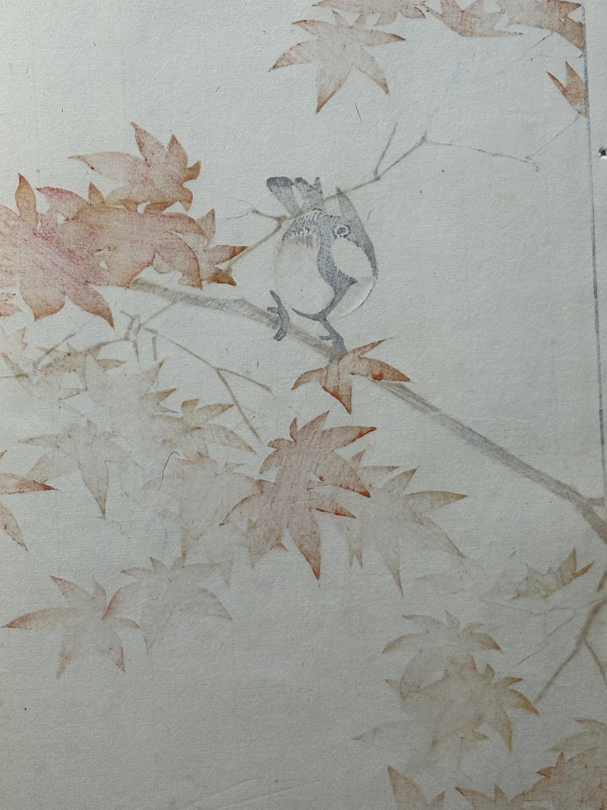 Japanese antique woodcut print, 1892, Imao Keinen, "Maple, Japanese tit"