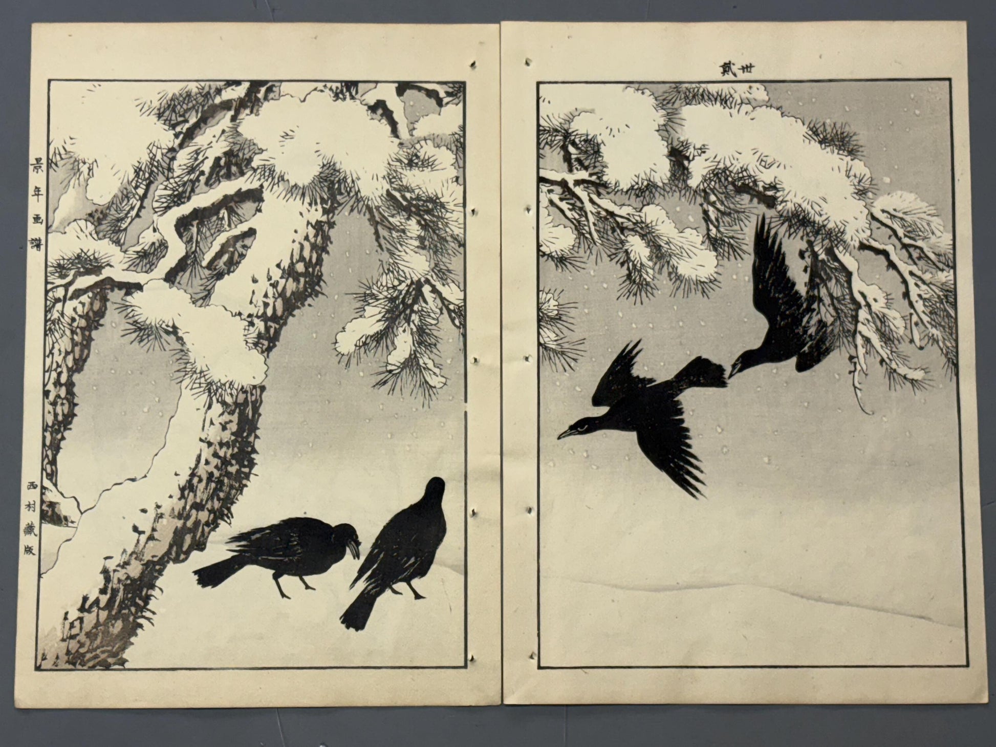 Japanse antique woodcut print, 1892, Imao Keinen, "Pine, Crow"