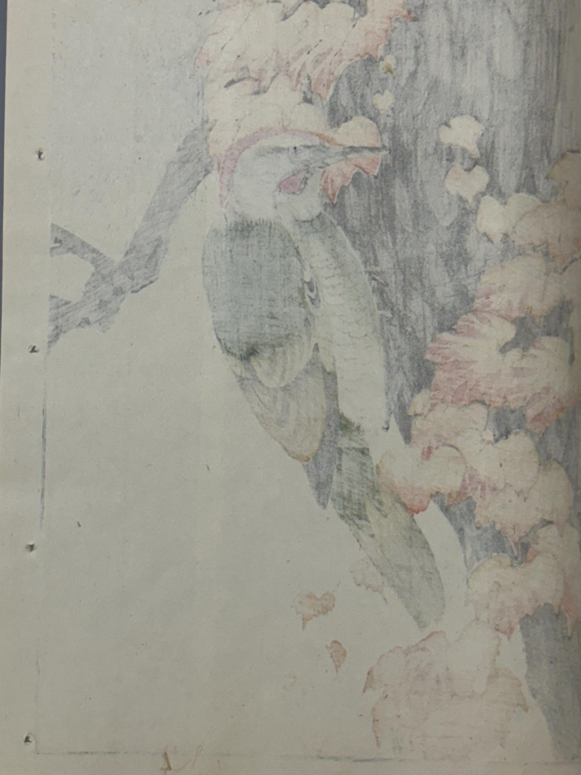 Japanese antique woodcut print, 1892, Imao Keinen, "Old pine, Japanese green Woodpecker"