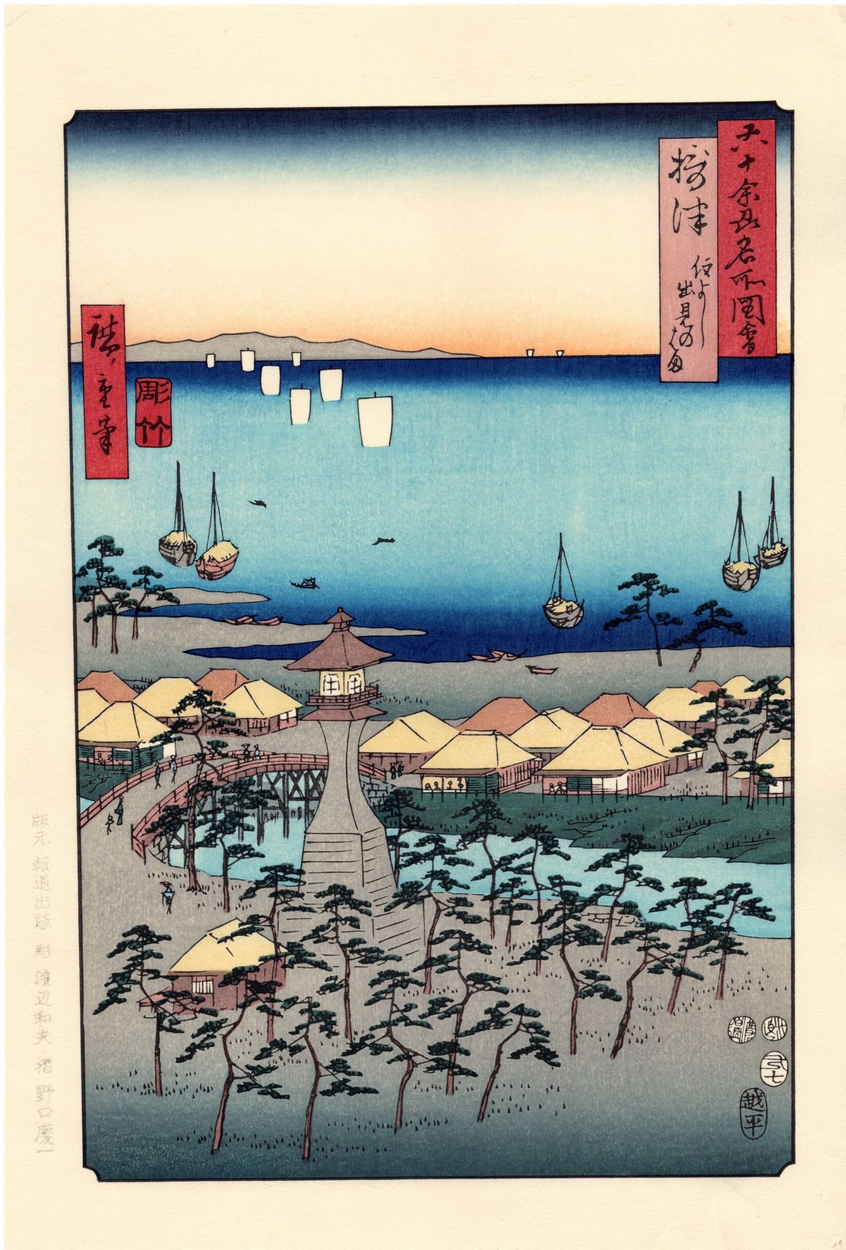 Japanese Ukiyoe, woodcut print, Utagawa Hiroshige, "Settsu Province: Sumiyoshi, Idemi Beach (Settsu, Sumiyoshi, Idemi no hama)"