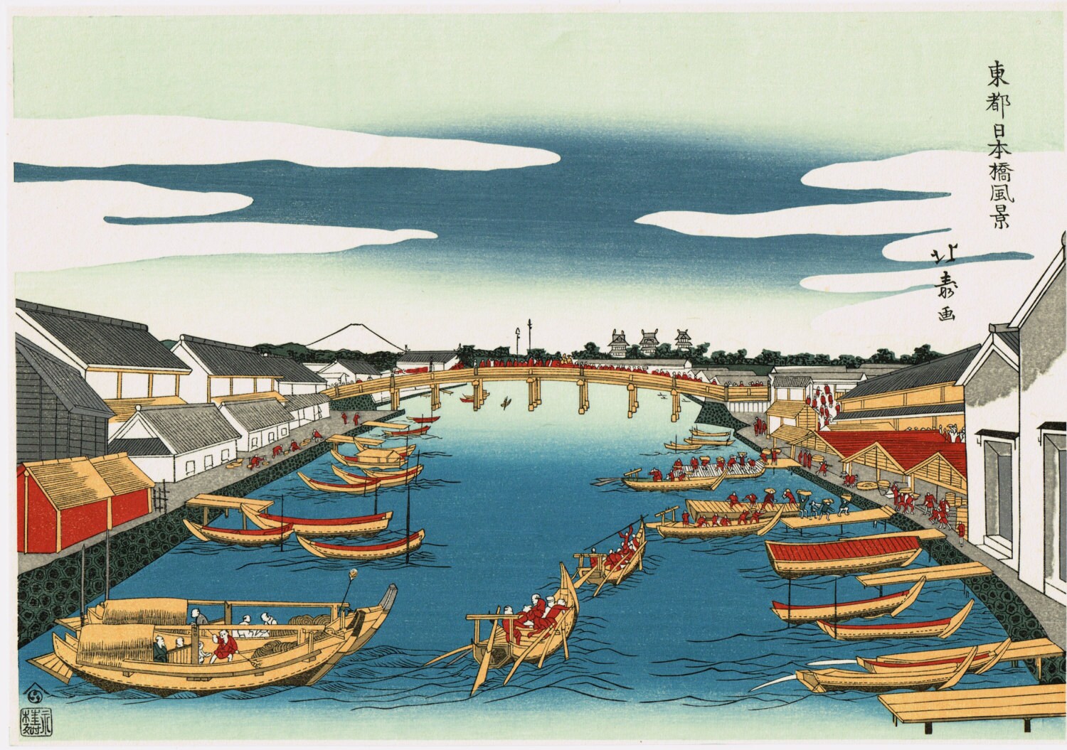 Japanese Ukiyo-e Woodblock print, Shotei Hokuju, "View of Nihonbashi Bridge "