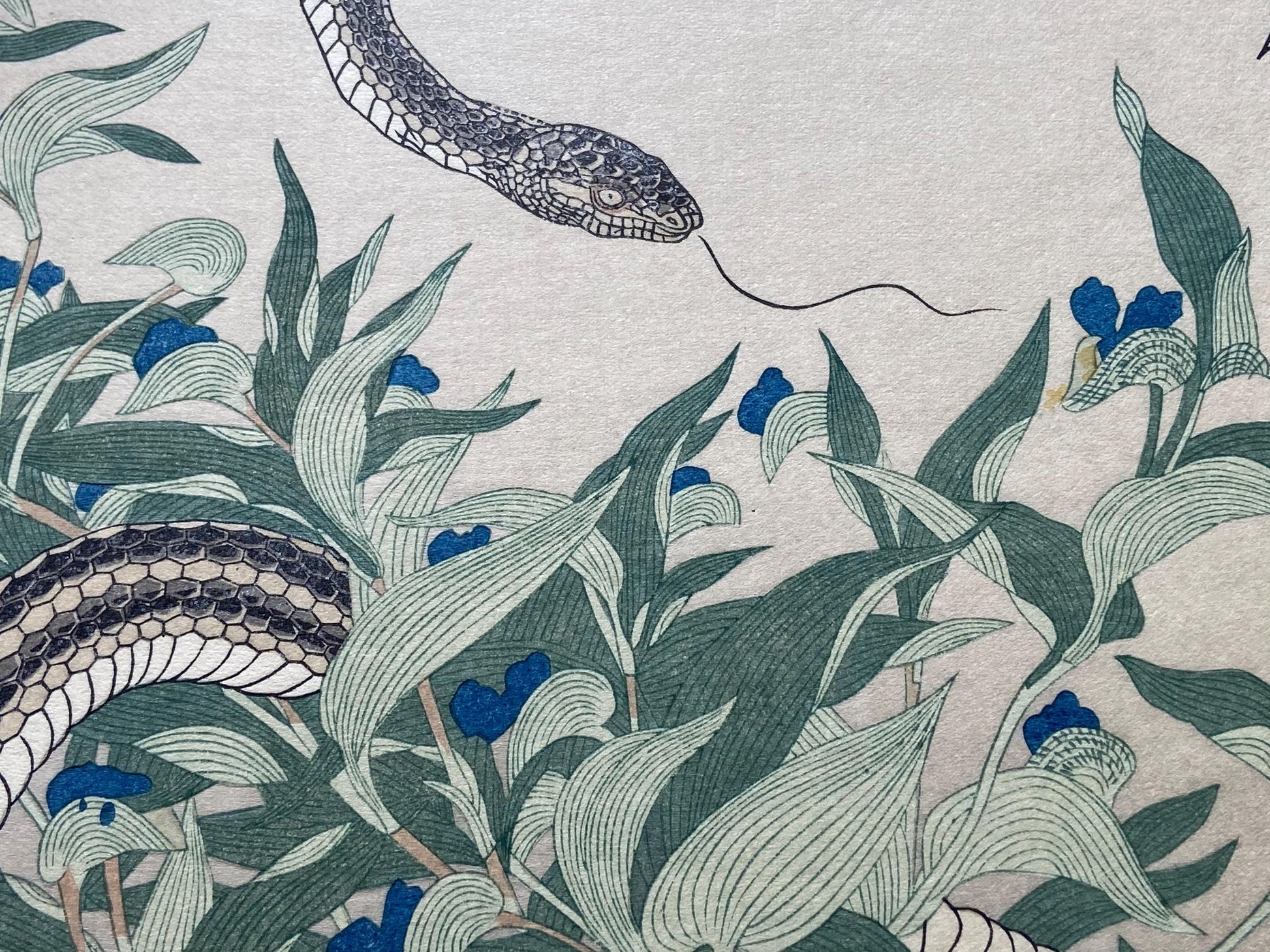 Japanese Ukiyoe, woodcut print, Utamaro, "Skink (Tokage) and Rat Snake (Hebi)"