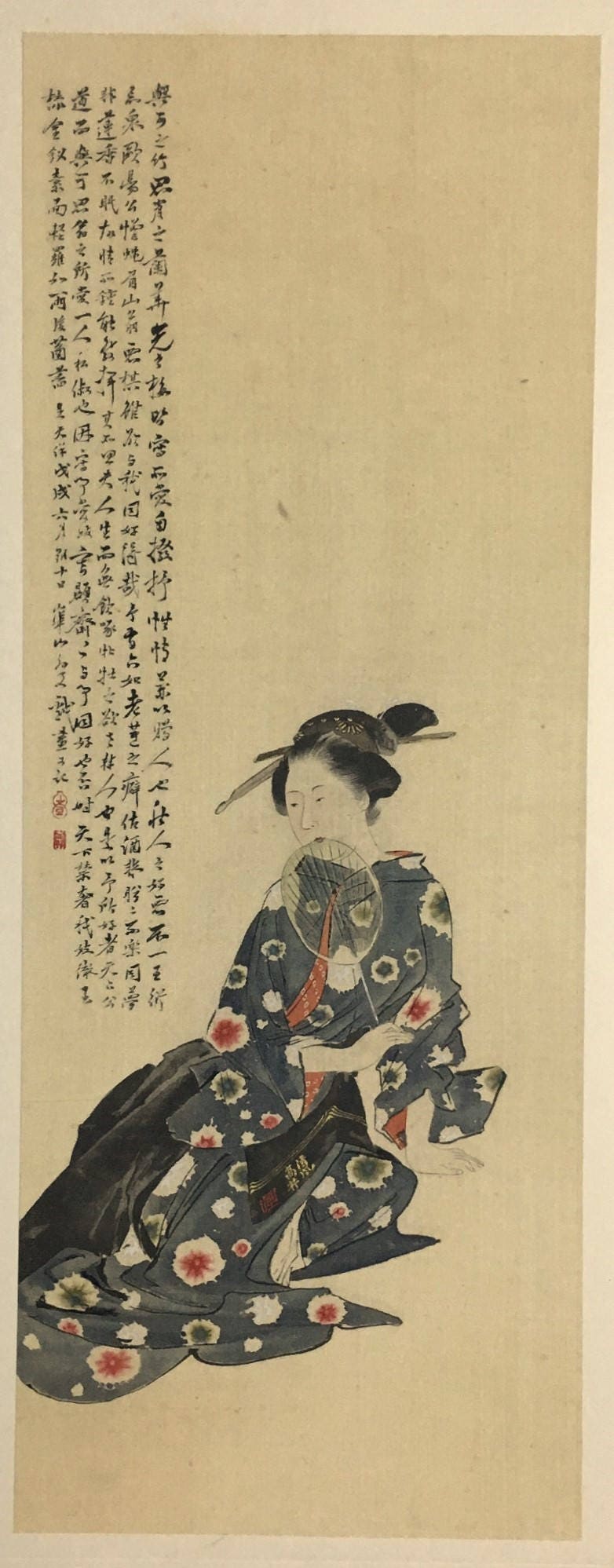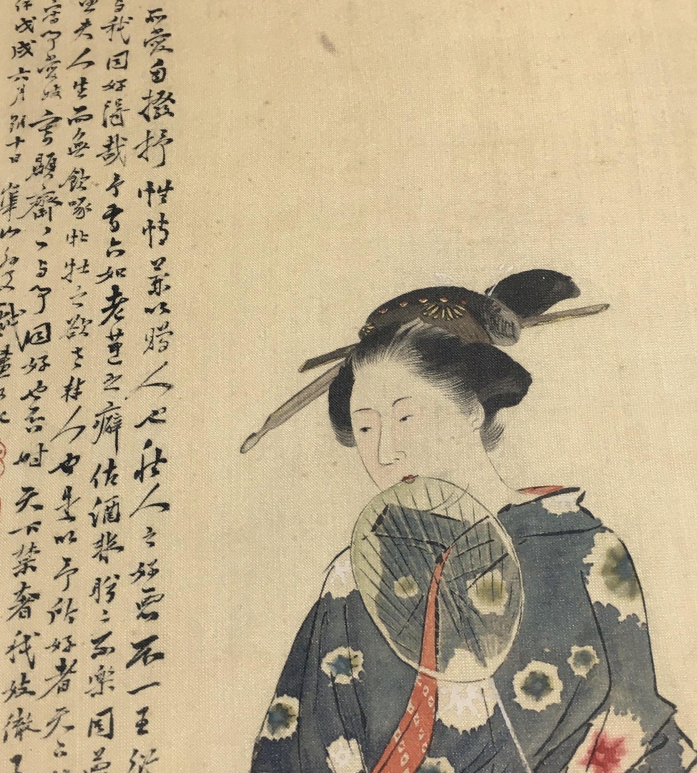 1909, Japanese antique woodblock print, Watanabe Kazan, "所歓校書図".
