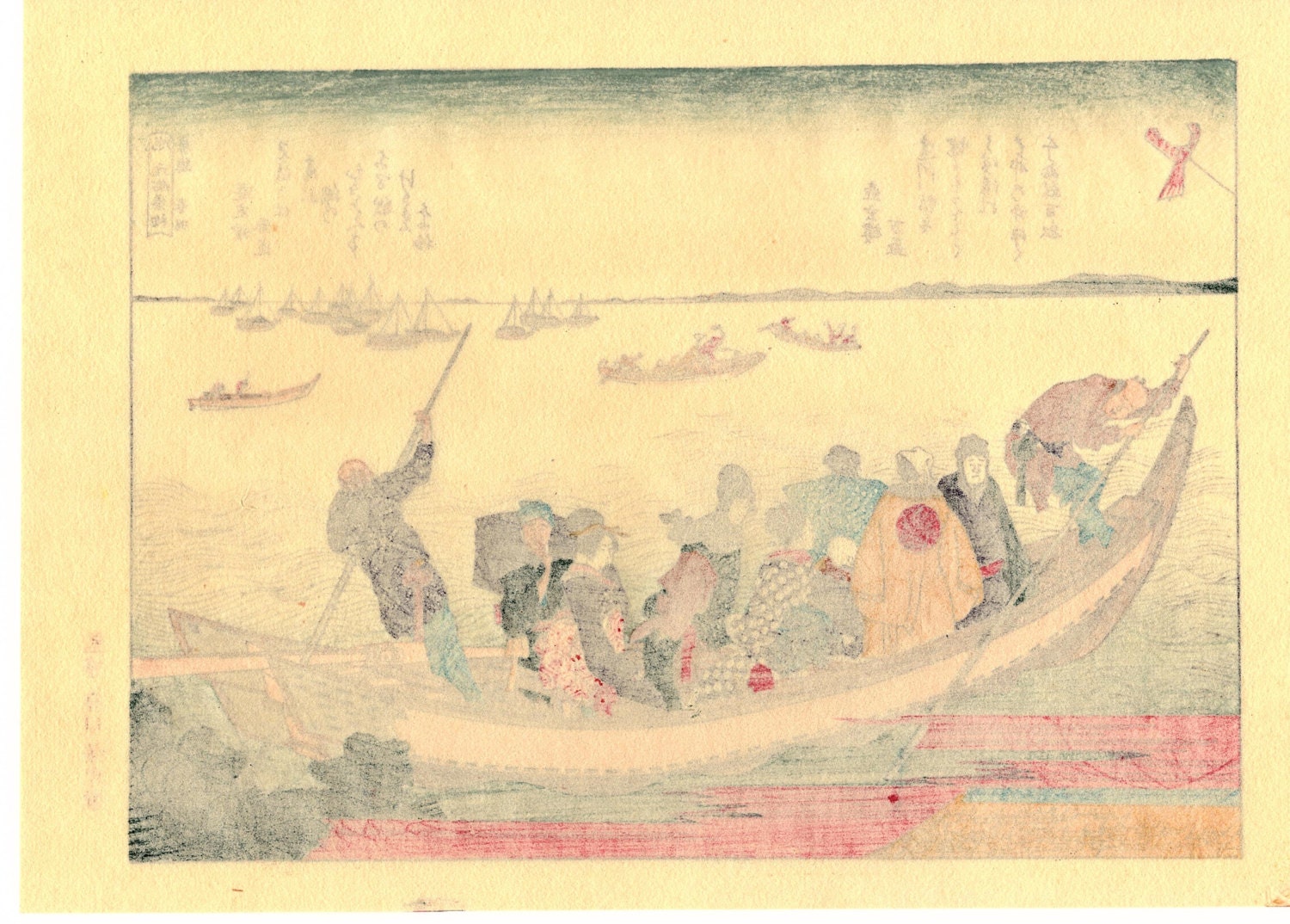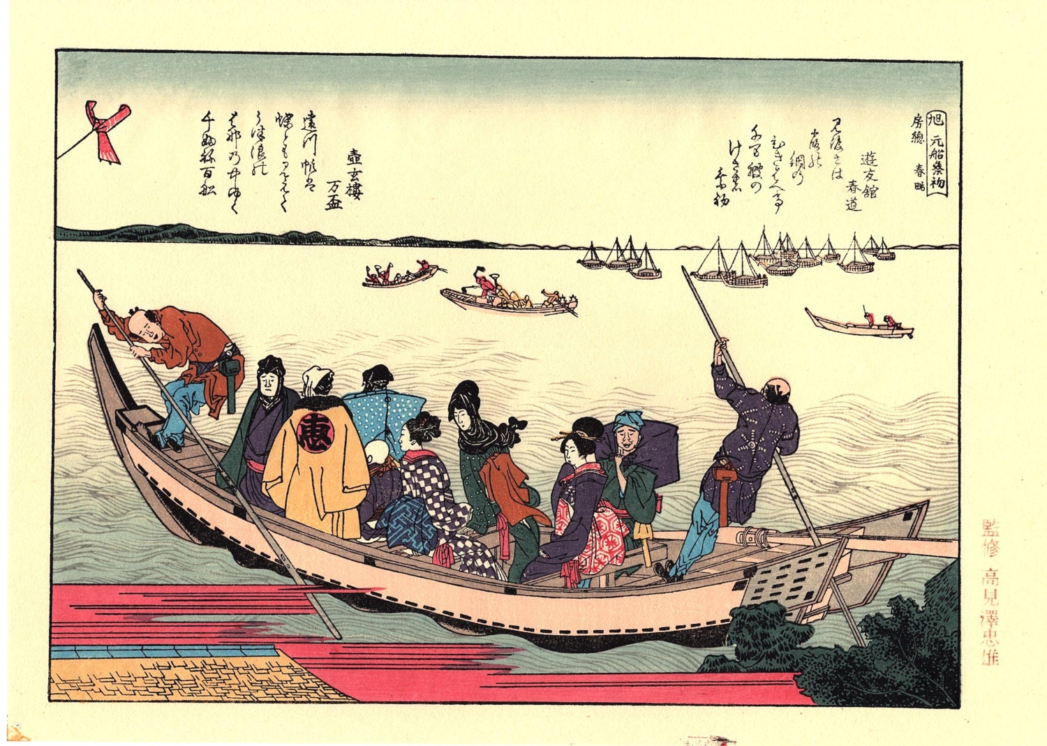 Japanese Ukiyoe, Woodblock print, Katsushika Hokusai, "The first ferry-boat on the new year's morn"