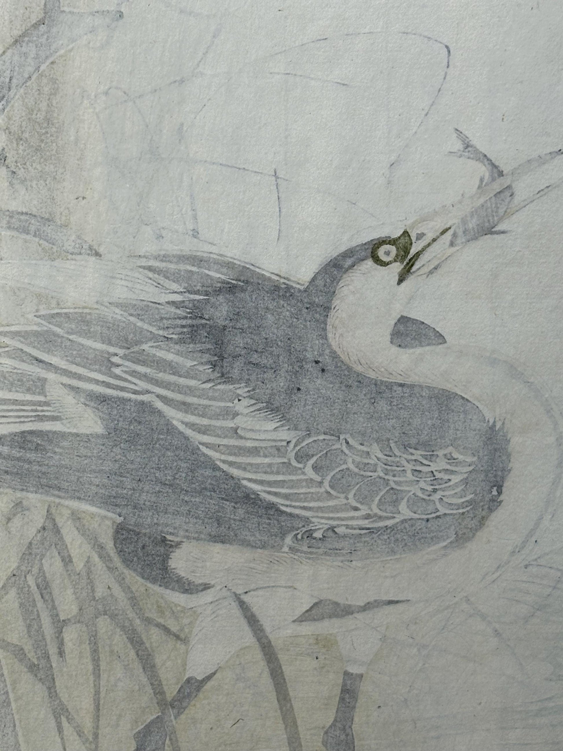 Japanese antique woodcut print, 1892, Imao Keinen, "Willow, Gray heron"