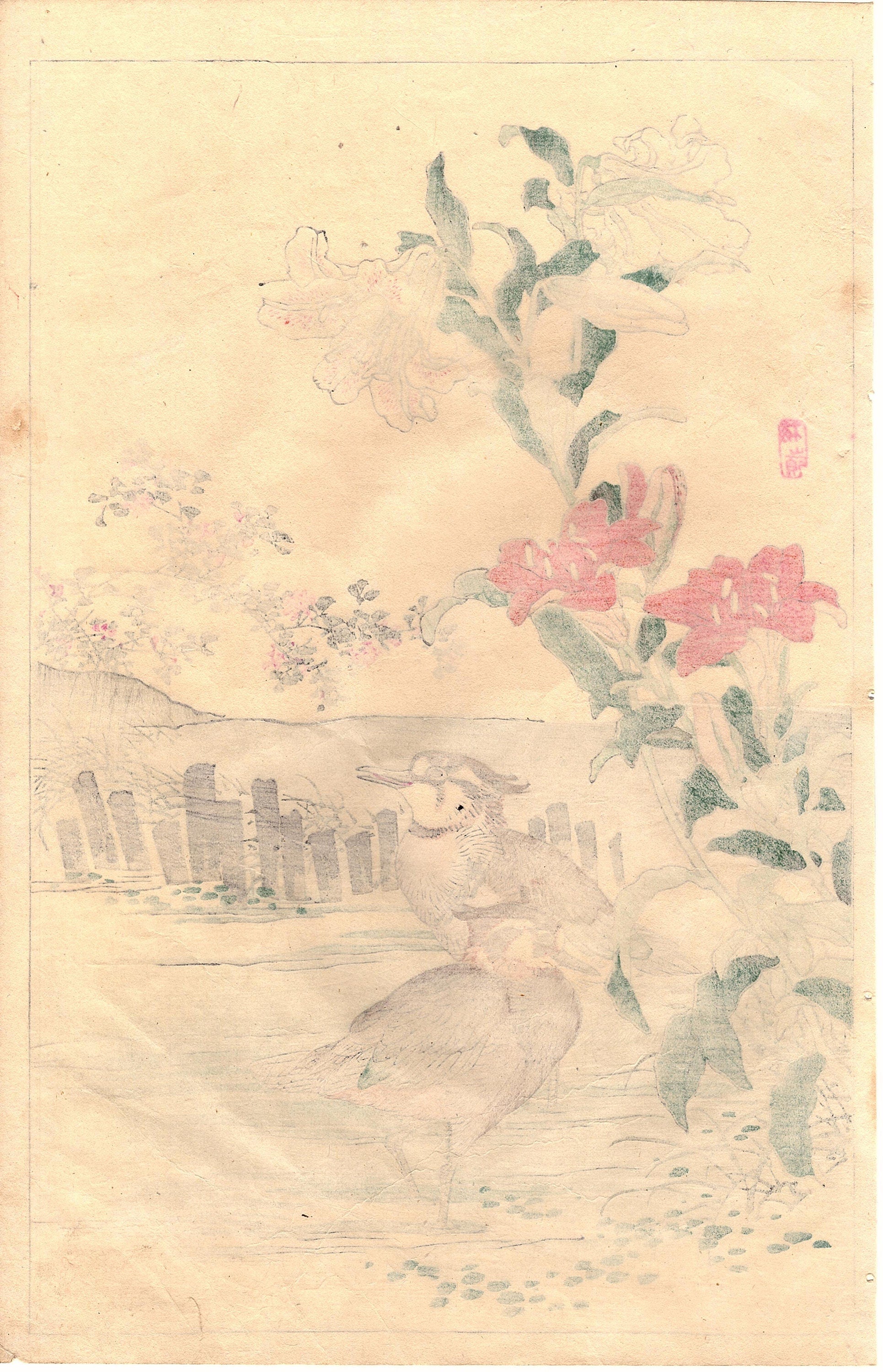 Japanese Antique Original Woodcut Print, Kono Bairei, "Bairei’s Book of Birds and Flowers". 2