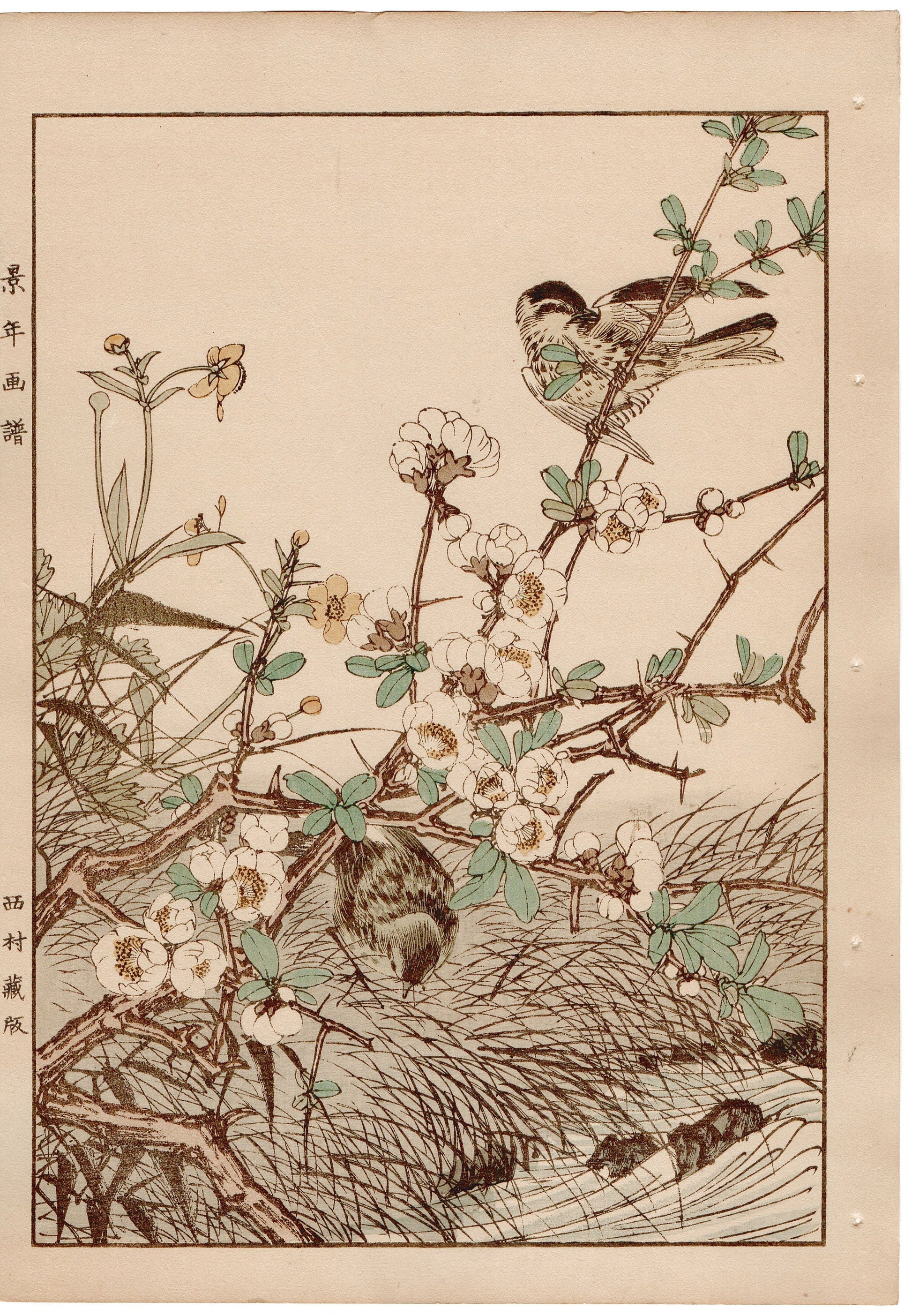 1892, Imao Keinen, " Japanese quince (Bokenohana), Japanese Buttercup (Umanoashigata), Siskin (Mahiwa) "