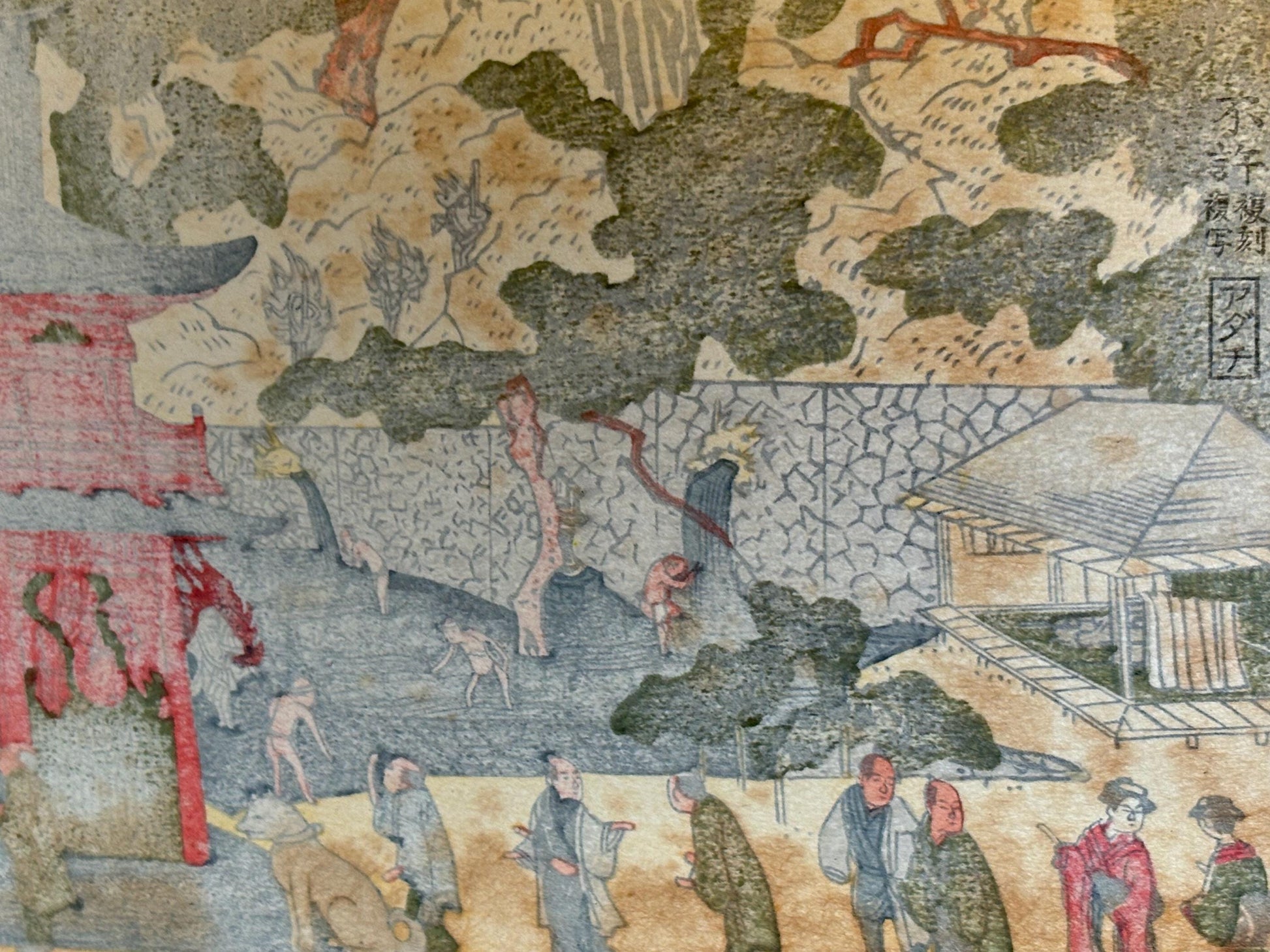 Japanese Ukiyoe, woodcut print, Utagawa Toyokuni, "Sight at Meguro-san in Uki-e Style"
