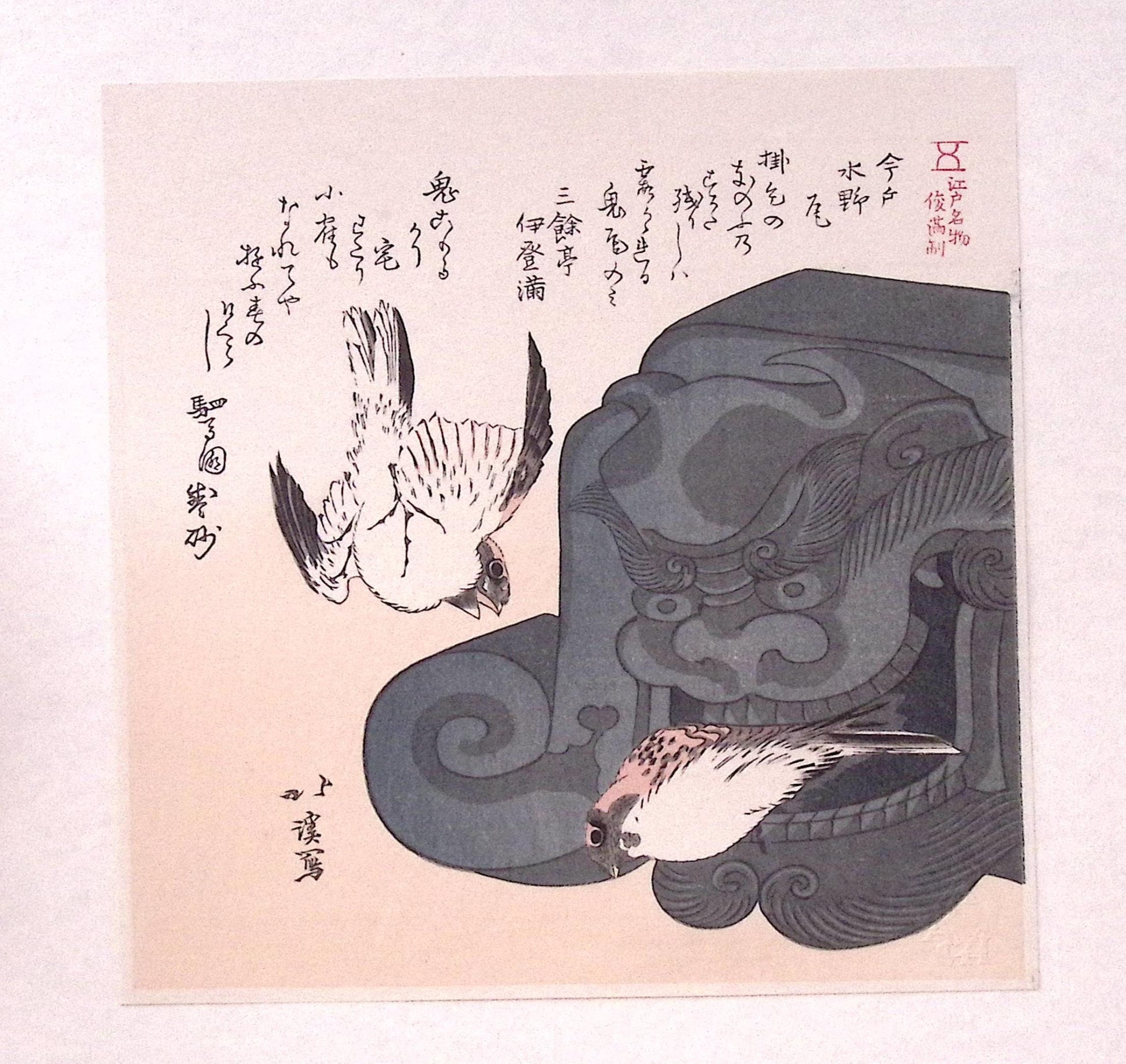 Japanese Ukiyoe, woodcut print, Totoya Hokkei, "Roof Tile and Sparrows"