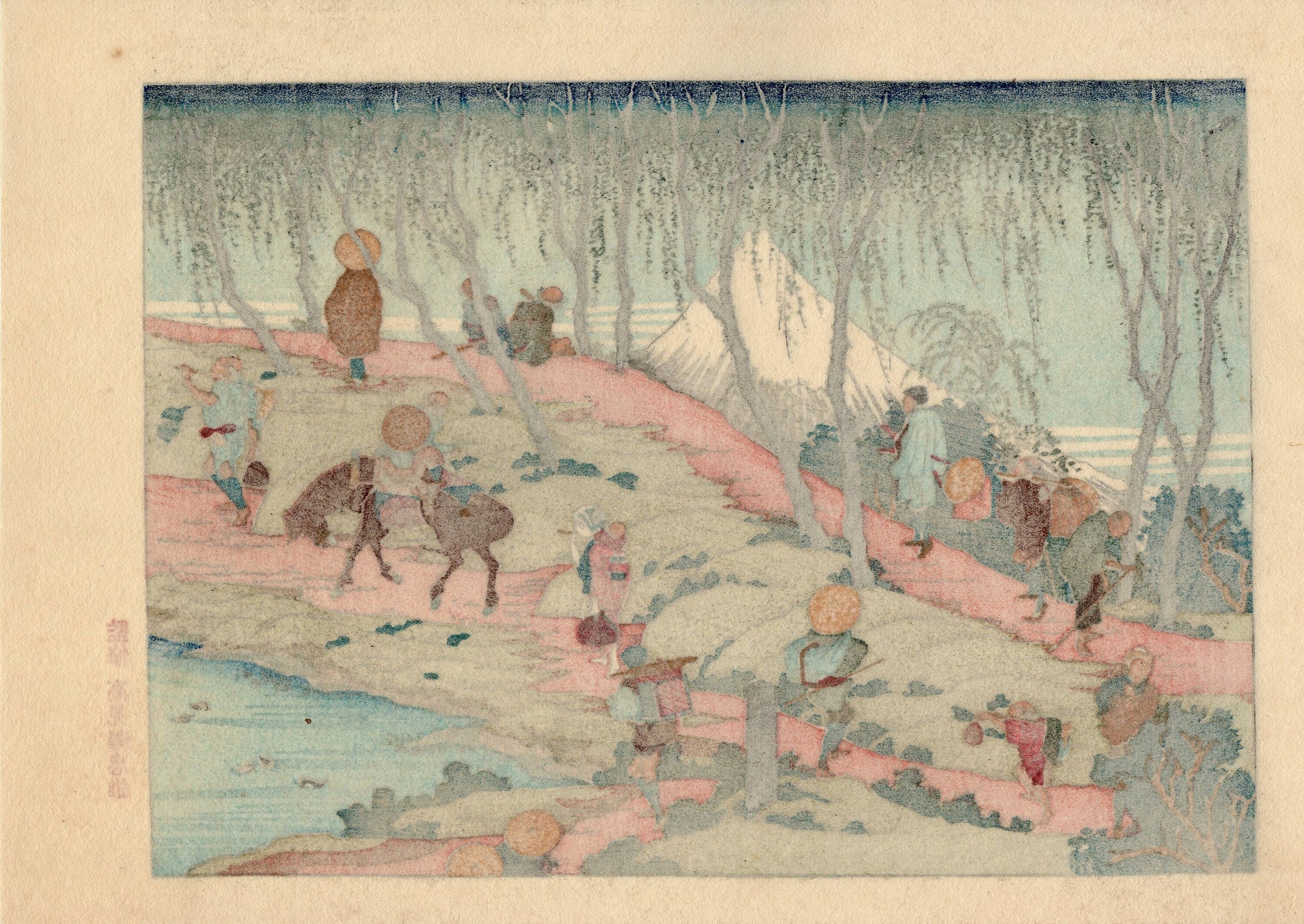 Title: Japanese Ukiyoe, Woodblock print, Katsushika Hokusai, "Mt.fuji seen from willows bank"