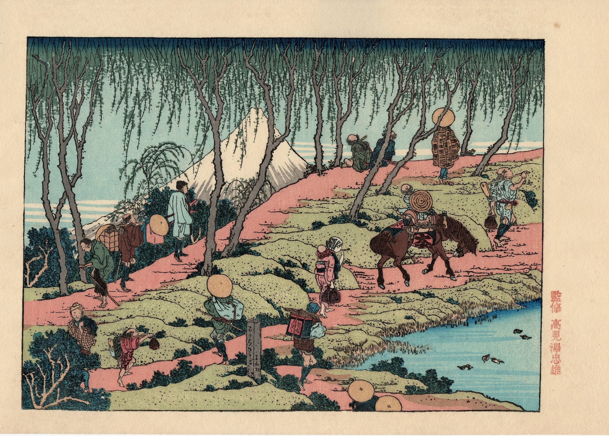 Japanese Ukiyoe, Woodblock print, Katsushika Hokusai, "Mt.fuji seen from willows bank"